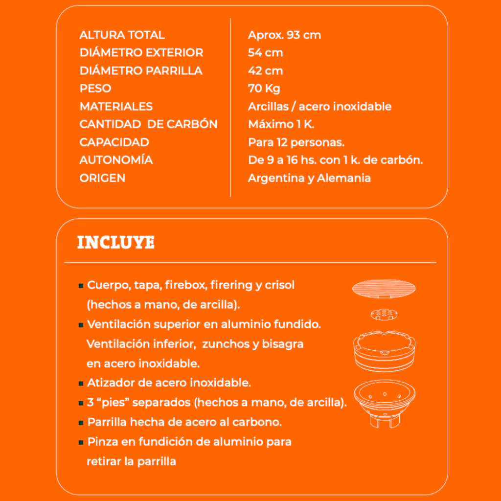 Cuerpo, tapa, firebox, firering y crisol están hechos a mano de arcilla