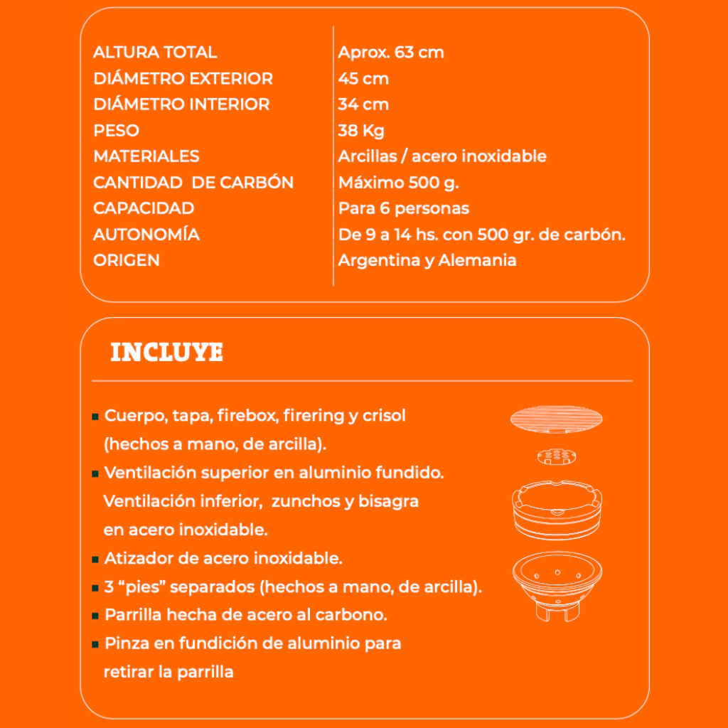 Cuerpo, tapa, firebox, firering y crisol están hechos a mano de arcilla